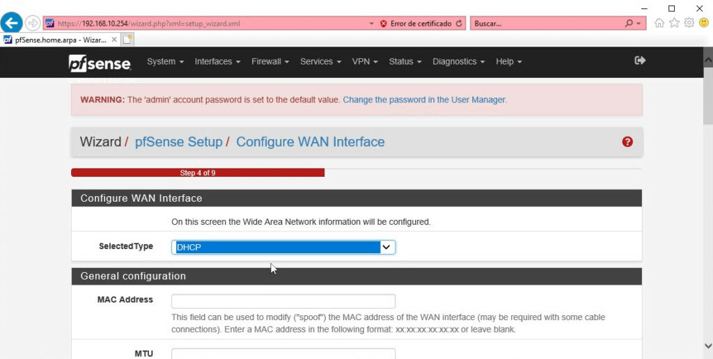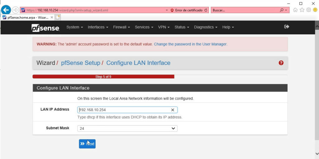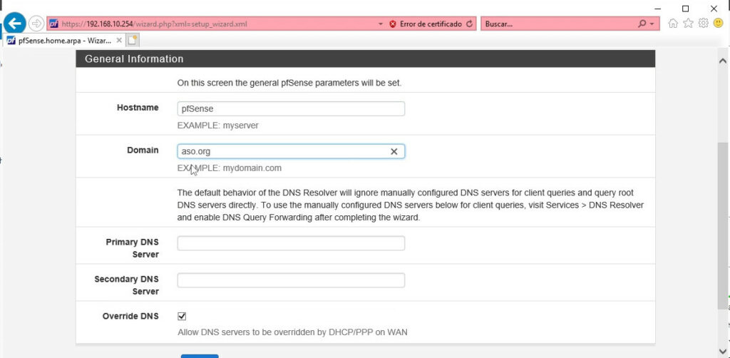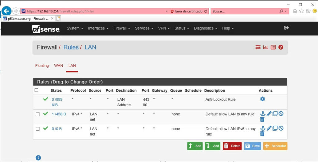 Una vez configurada la interfaz interna podemos acceder a la configuración web, donde podemos completar la configuración de pfsense y comprobar que se haya configurado la reglas del firewall.