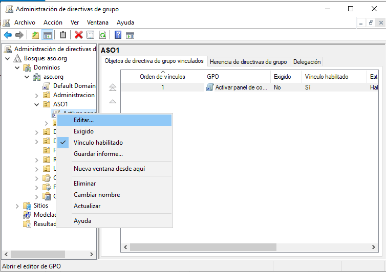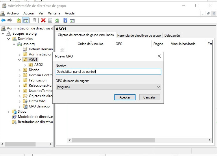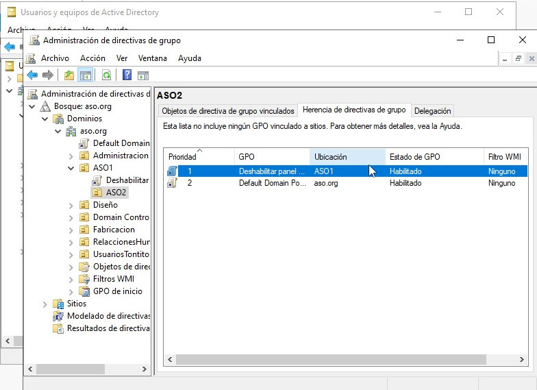Ahora si creamos una GPO dentro de ASO1 y en ASO2 entramos en la pestaña llamada herencia de directivas de grupo vemos la GPO creada por defecto y otra que es la que nosotros hemos creado.