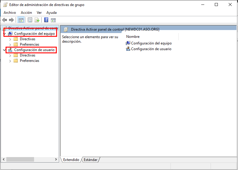 Dentro de la ventana que se abre se ve que podemos modificar configuraciones a nivel de equipo o a nivel de usuario, cuando se aplican a nivel de equipo, el equipo hay que poner un equipo en la unidad organizativa creada y si es una de nivel del usuario hay que añadir usuarios a la unidad organizativa.