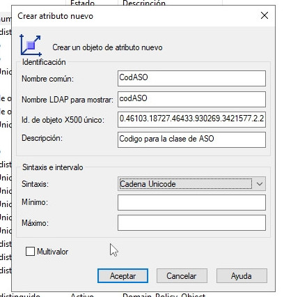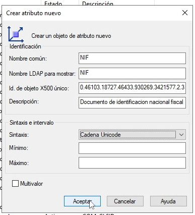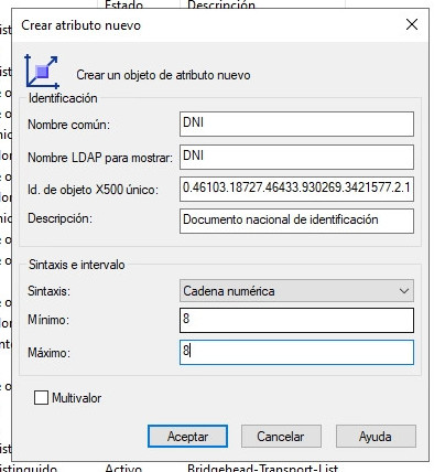 Una vez este añadido lo podemos desplegar y en atributos pulsar el botón de crear nuevo y rellenar los bloques de texto. En el bloque de Id. de Objeto X500 tenemos que añadir el root OID seguido de .2.X de la siguiente forma (Si el root OID es el siguiente: 1.2.840.113556.1.8000.2554.50431.33790.46103.18727.46433.930269.3421577 hay que poner así: 1.2.840.113556.1.8000.2554.50431.33790.46103.18727.46433.930269.3421577.2.1)