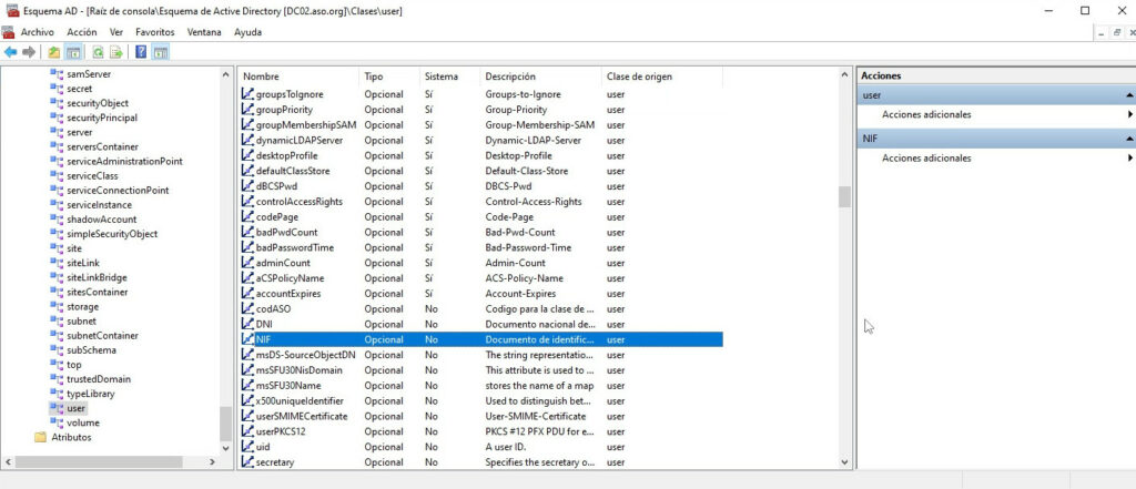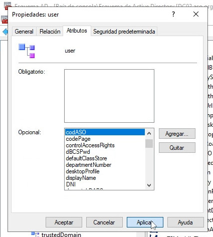 Ahora para añadir el artibuto al usuario tenemos que ir dentro de clases y buscar user. Hacer clic derecho y entrar en propiedades y dentro ir a la pestaña atributos, pulsar añadir y buscar los atributos que queremos añadir. Cuando acabamos de añadir nos muestra un error que podemos descartar.