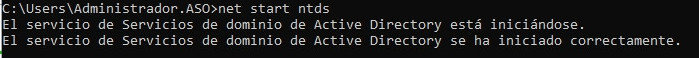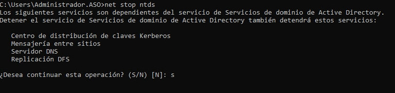 Una vez añadido para que se ejecuten los cambios tenemos que reiniciar el servicio de Active Directory, para ello abrimos un símbolo del sistema y ejecutamos «net stop ntds» y «net start ntds» para ejecutarlo después.