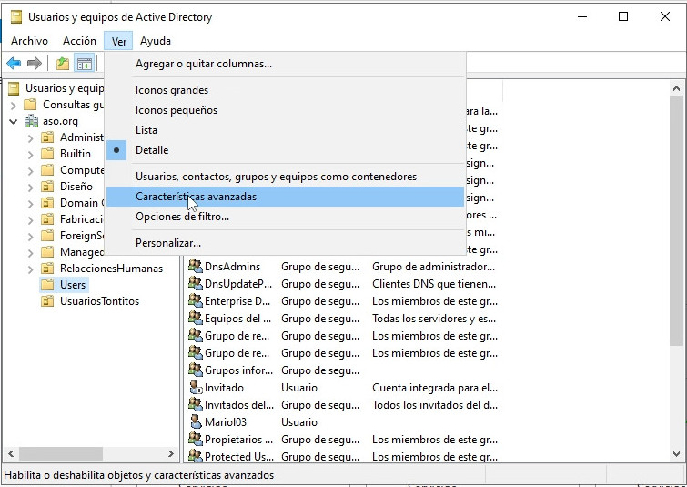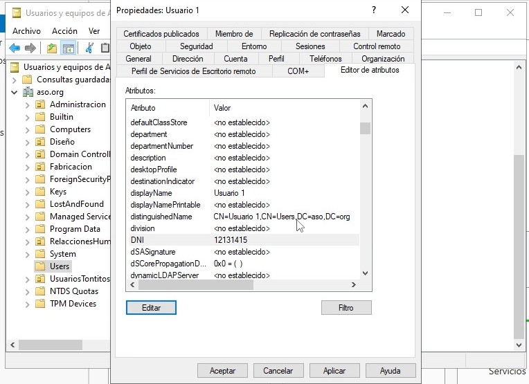 Para añadir un valor a estas características nuevas tenemos que ir a usuarios y equipos de active directory y activar las características avanzadas, una vez hecho si entramos en las propiedades del usuario podemos ver el editor de atributos donde podemos modificar todos los atributos de un usuario.
