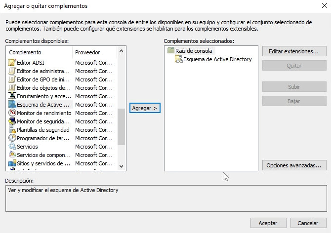 Una vez obtenido el root OID podemos abrir la consola de mantenimiento de microsoft usando el comando mmc y añadir el complemento llamado «Esquema de Active Directory».