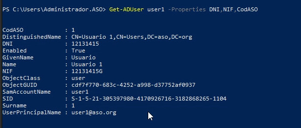 Una vez añadido el atributo podemos ejecutar una consulta usando powershell y ver el atributo añadido.