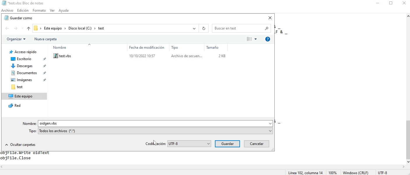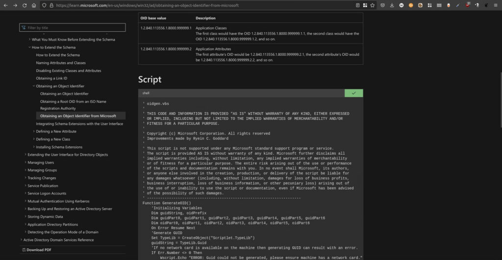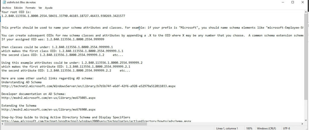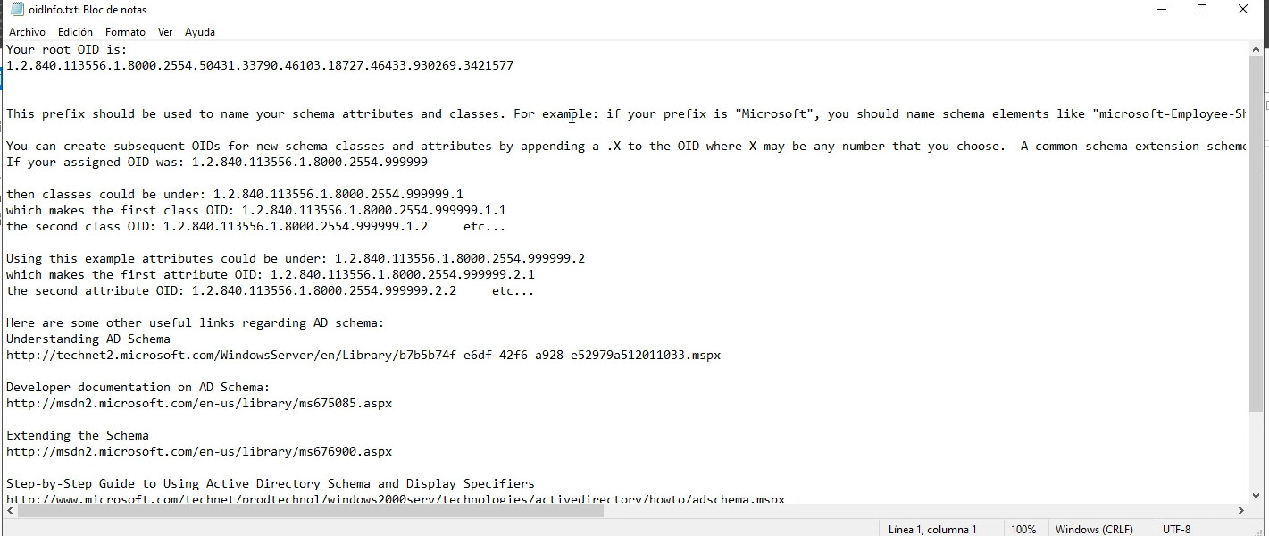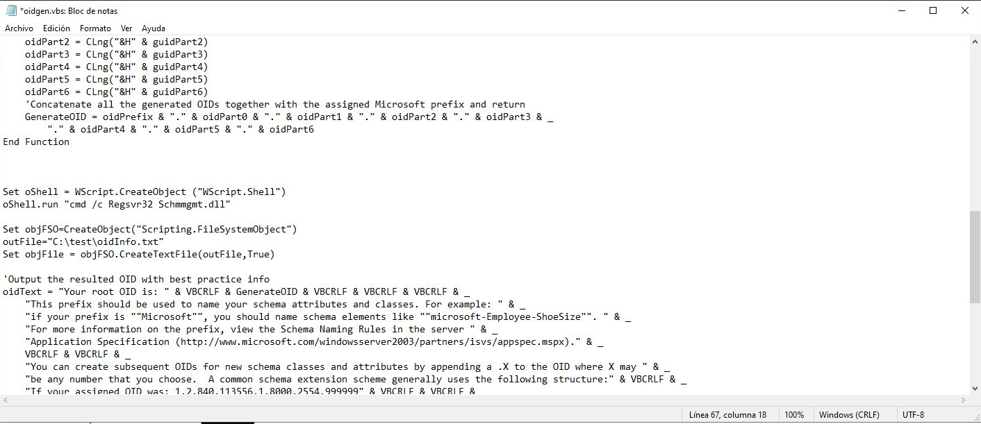 Active directory permite modificar las clases de un usuario, de un grupo, de un equipo y más para añadirles atributos como identificadores. Para ello debemos de generar un OID (identificador único de objeto) a partir de un root OID que lo generamos gracias a un script vbs que Microsoft tiene publicado en el siguiente enlace: https://learn.microsoft.com/es-es/windows/win32/ad/obtaining-an-object-identifier-from-microsoft. Este script lo copiamos y lo ejecutamos dentro, si da un error es que esta configurado para un sistema Windows en ingles y la ruta donde guarda un fichero de texto no existe.
