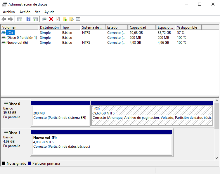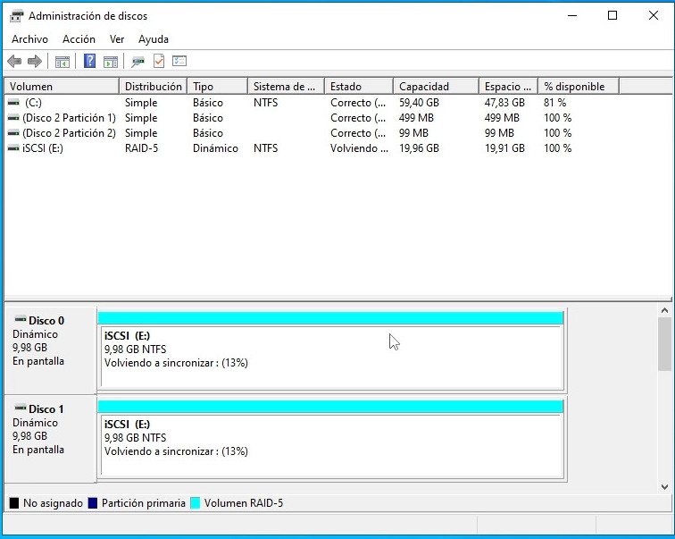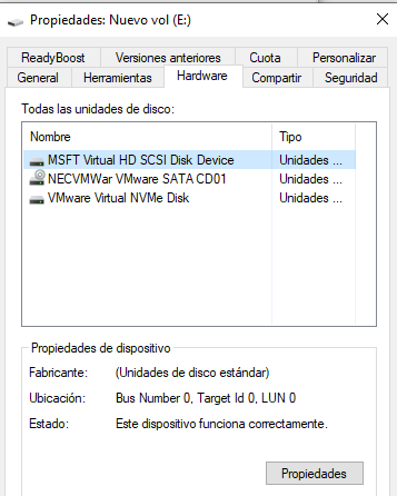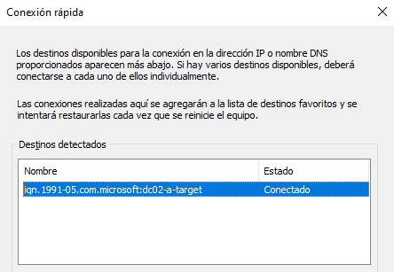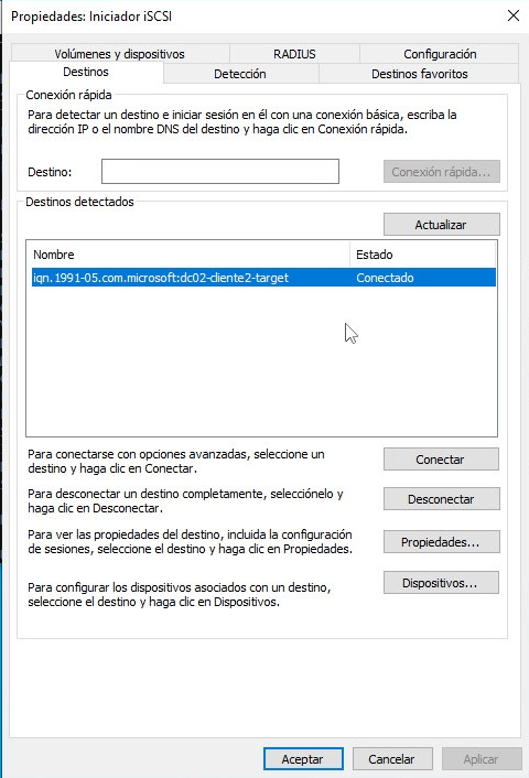 Una vez creado el disco virtual en el equipo que queremos usar como cliente abrimos el iniciador iSCSI y ponemos la dirección IP del servidor o el nombre de equipo del servidor, en la ventana que sale podemos ver los destinos que tiene abiertos para ese equipo. Para comprobar que esta conectado podemos abrir el administrador de discos y ver si aparece un nuevo disco que podamos formatear y una vez formateado podemos ver la pestaña de hardware cuando hacemos clic derecho en el volumen.