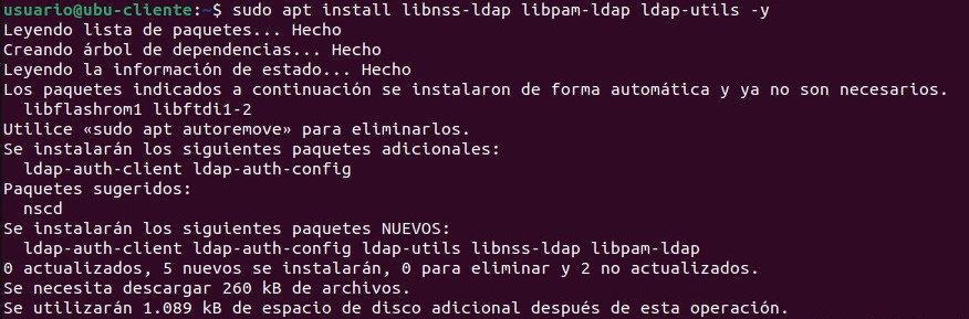 Para poder usar los usuarios del servidor tenemos que instalar unas herramientas y para ello ejecutamos el comando (sudo apt install libnss-ldap libpam-ldap ldap-utils), mientras se esta instalando tenemos que poner los datos del servidor LDAP, si no funciona o si hemos puesto la contraseña incorrecta podemos usar el comando (dpkg-reconfigure ldap-auth-config).