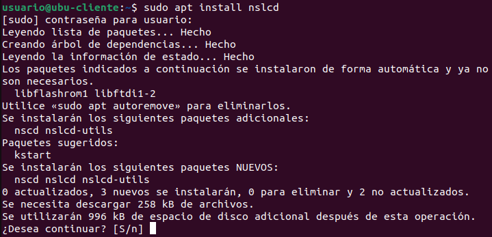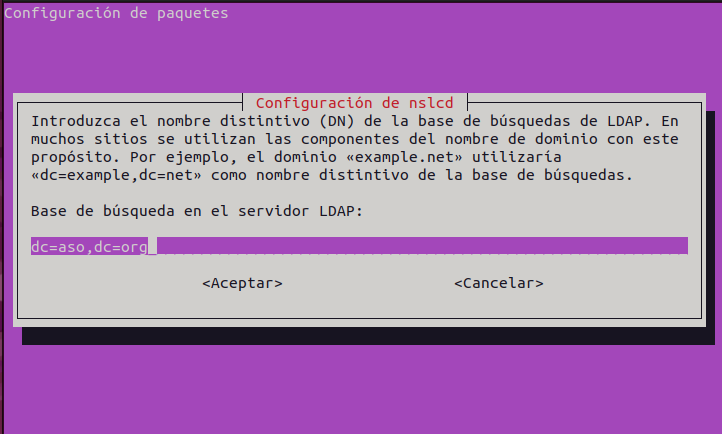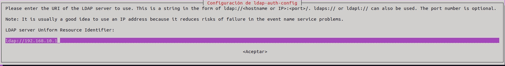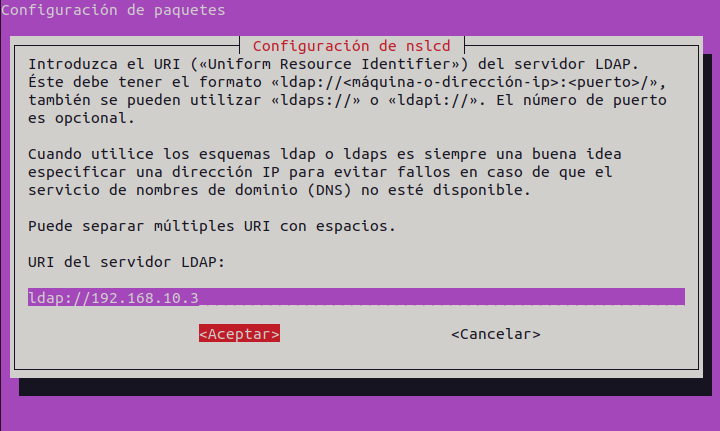 Para iniciar sesión gráfica en el cliente Ubuntu tenemos que añadir el paquete nslcd, mientras se está instalando este preguntará por los datos del servidor de LDAP.