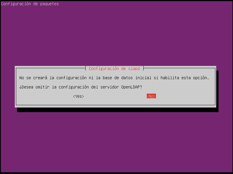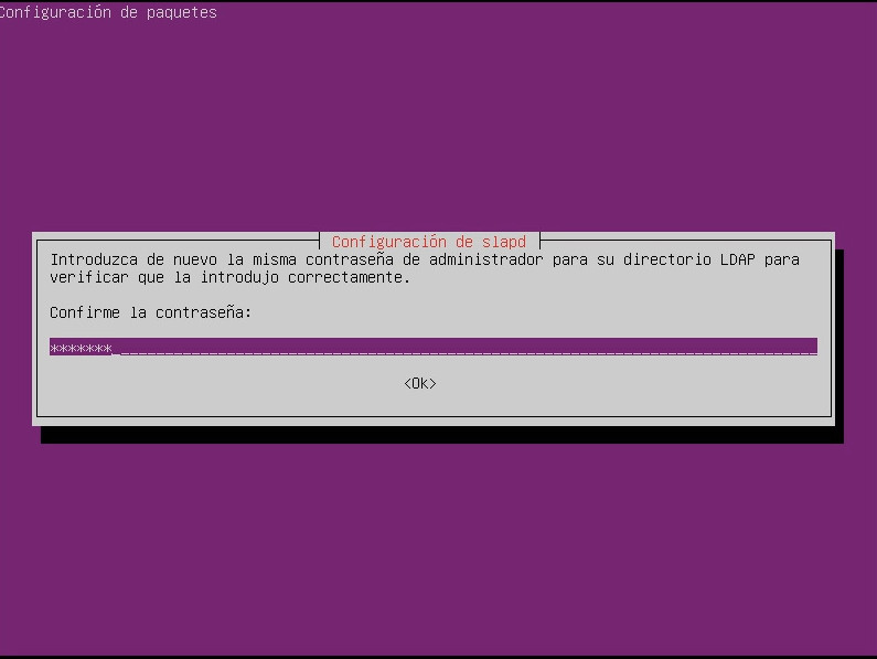 Una vez instalado tenemos que actualizar los repositorios y los paquetes con (sudo apt update && sudo apt upgrade -y). Una vez actualizado el sistema ejecutamos (sudo apt install slapd ldap-utils) para instalar el servidor LDAP y las utilidades. Cuando este instaladonse nos preguntara por una contraseña, pero no le hacemos caso porque cuando halla acabado ejecutado sudo dpkg-reconfigure slapd para poder personalizar el nombre del dominio.