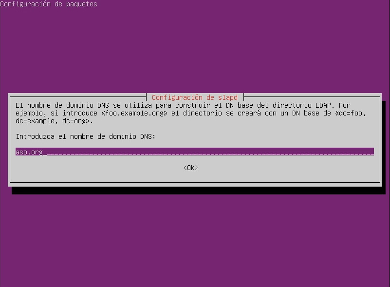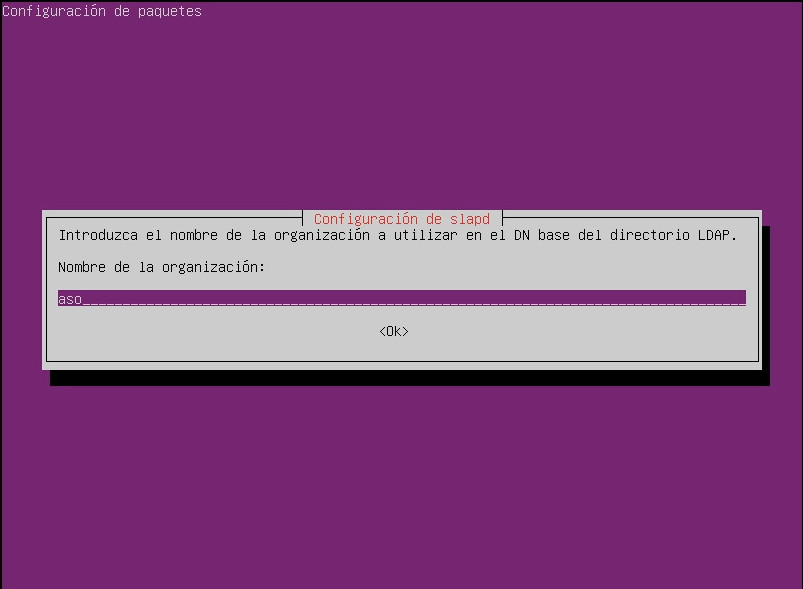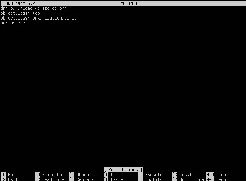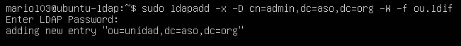 Para añadir la UO al dominio ejecutamos «sudo slapadd -x -D cn=admin,dc=aso,dc=org -W -f ou.ldif».