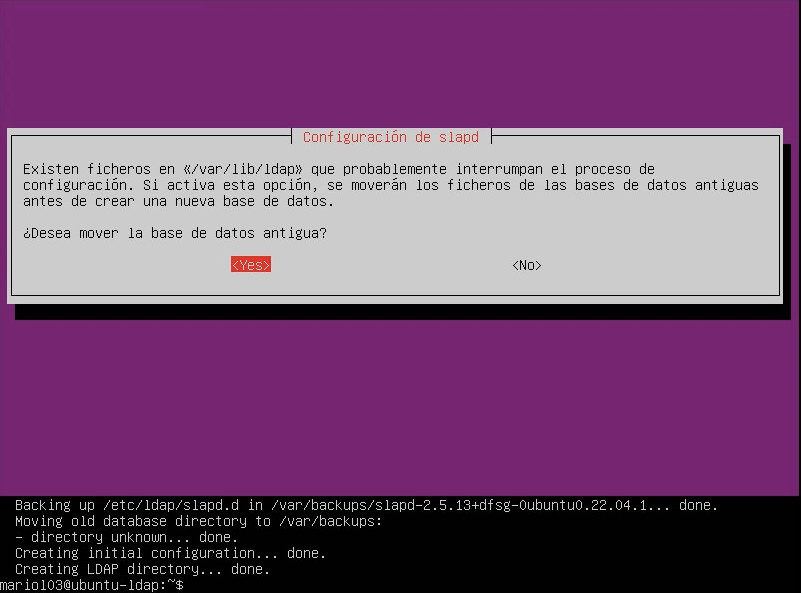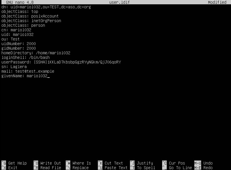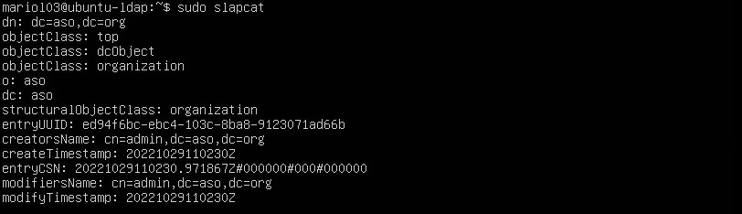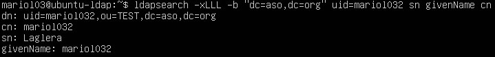 Podemos ver que estan bien configurado podemos ejecutar «slapcat», viendo todos los objetos creados o «ldapsearch -xLLL -b «dc=aso,dc=org» uid=mariol032 sn givenName cn» que buscará el usuario indicado.