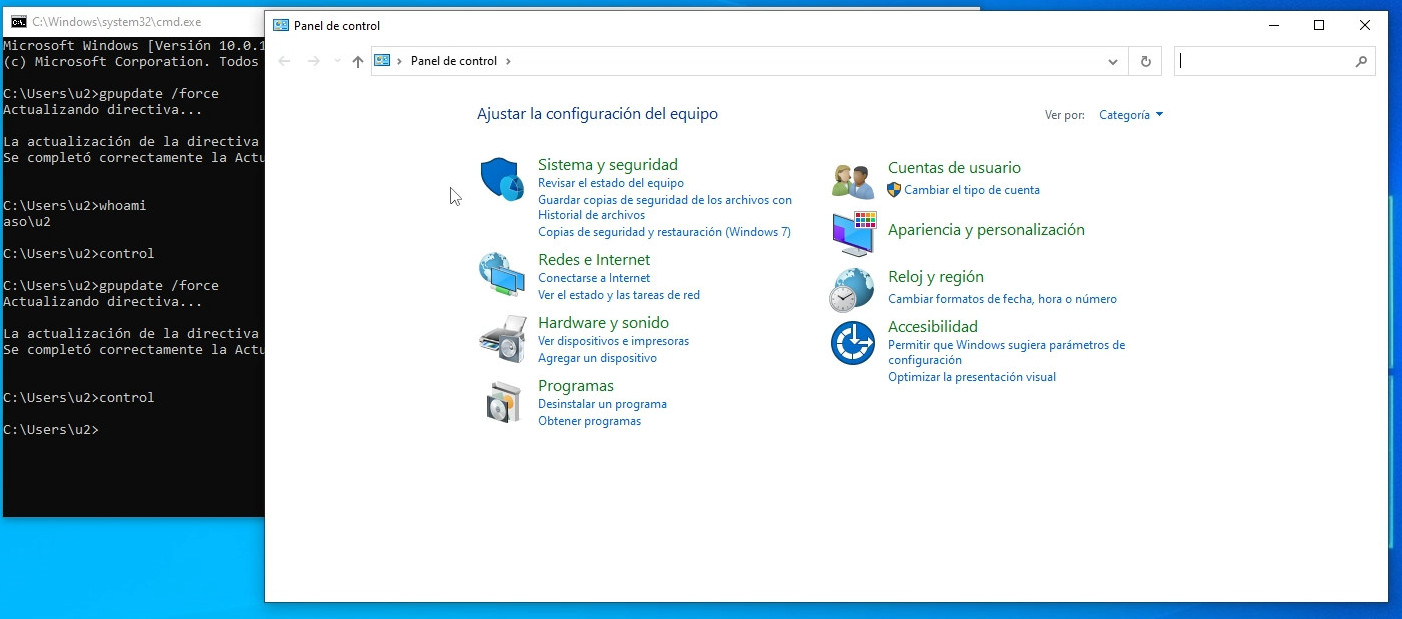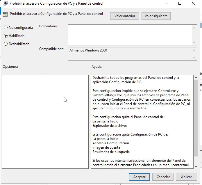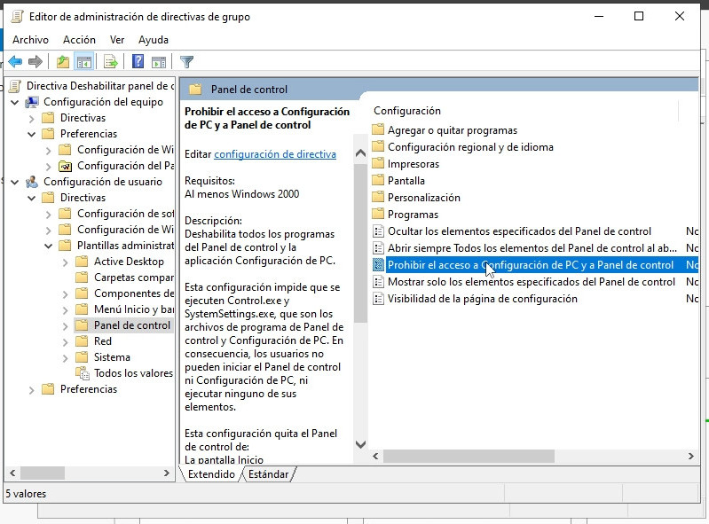 El bloqueo del panel de control se encuentra dentro de Configuración del usuario –> Directivas –> Plantillas Administrativas –> Panel de control y se llama «Prohibir el acceso a Configuración del PC y a Panel de control»