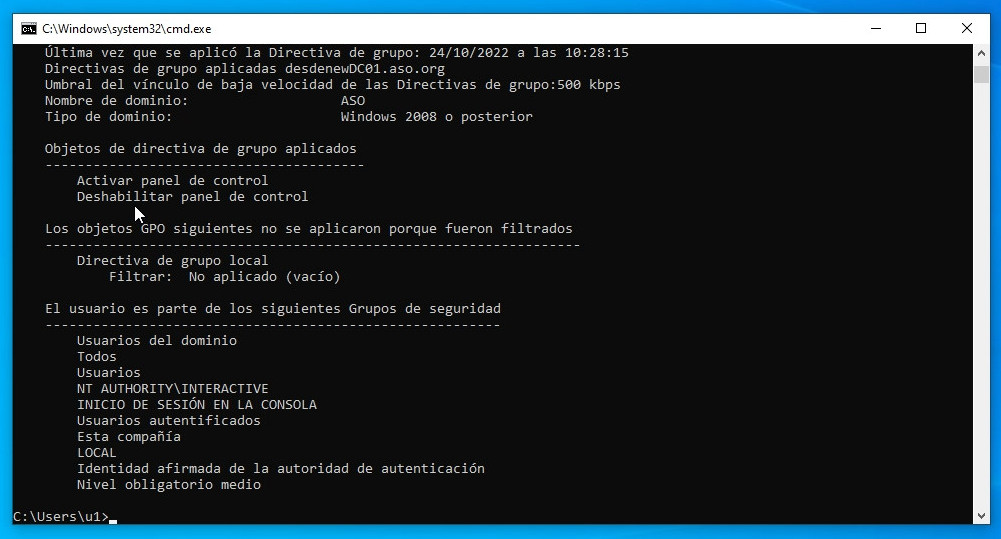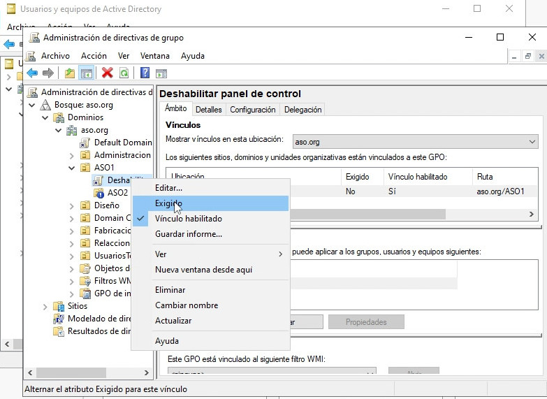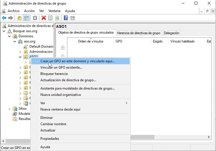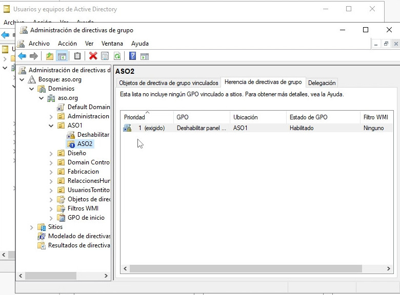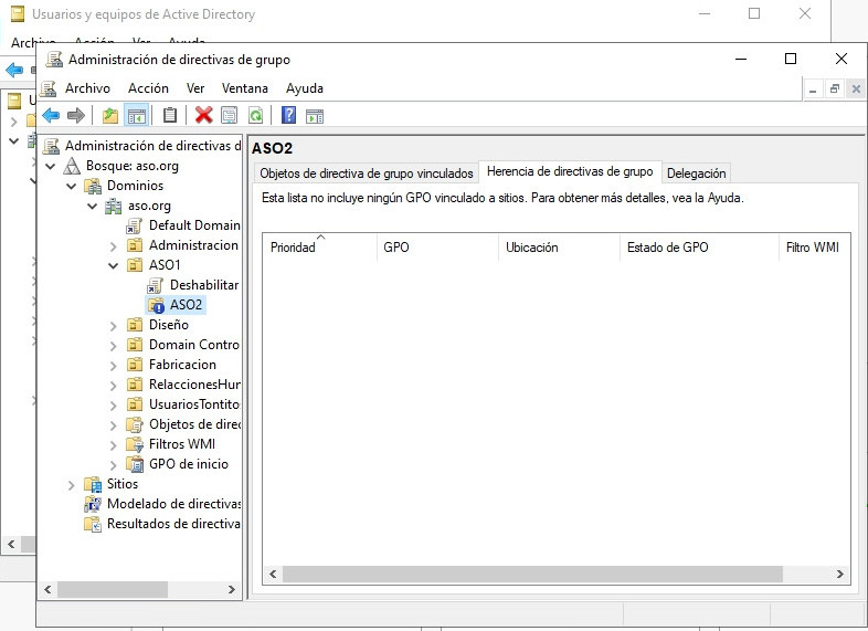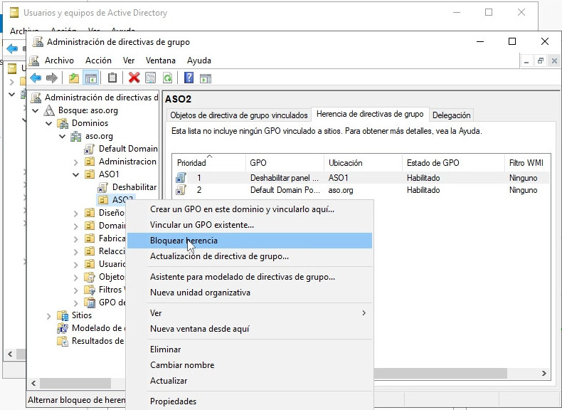 Esta herencia la podemos bloquear y veremos que ASO2 deja de tener las GPO heredadas, con la consecuencia de que lo que hemos bloqueado en ASO1 no estará bloqueado dentro de ASO2.