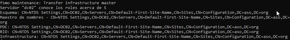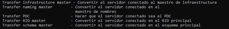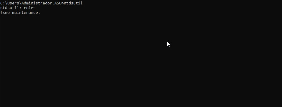 Los roles FSMO son aquellos que dice quien es el controlador del dominio «primario». Para transferirlos podemos usar el comando ntdsutil que sirve para gestionar el dominio, y para entrar en la configuración de los roles podemos usar roles.