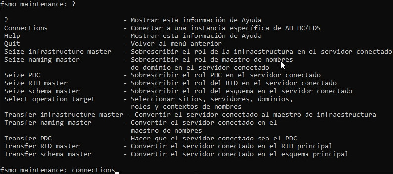 Una vez aquí usamos el comando «connections» para conectarnos al servidor al que queremos transferir los roles del dominio.