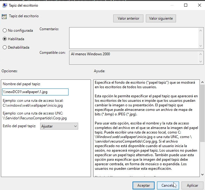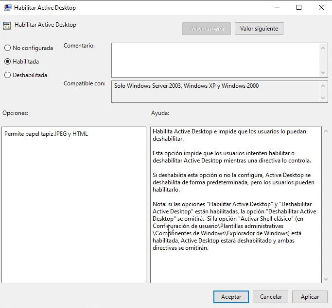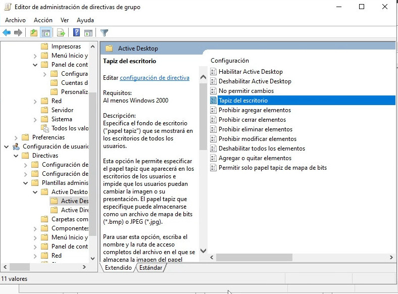 Podemos cambiar el fondo de escritorio de una unidad organizativa o de un grupo cambiando el valor de la GPO Habilitar «Active Desktop» y «Tapiz de escritorio«. Estas dos se encuentran en Configuración del usuario –> Directivas –> Plantillas Administrativas –> Active Desktop –> Active Desktop.