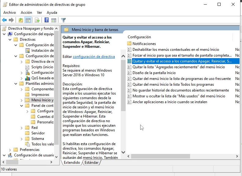 Para evitar que un usuario apague, reinicie o suspenda un equipo tenemos una directiva dentro de Configuración del equipo –> Directivas –> Plantillas administrativas –> Menú Inicio y barra de tareas y se llama «Quitar y evitar el acceso a los comandos Apagar, Reiniciar, Suspender e Hibernar»