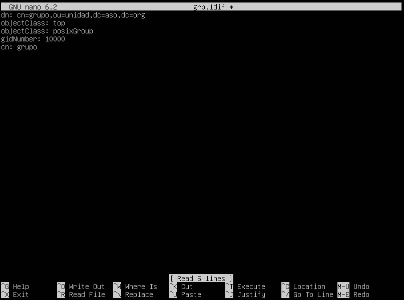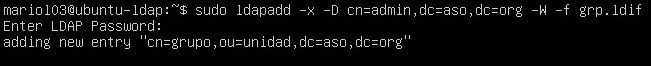 Para añadir el grupo al dominio ejecutamos «sudo slapadd -x -D cn=admin,dc=aso,dc=org -W -f ou.ldif».