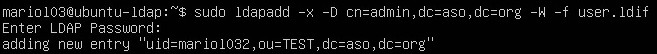 Para añadir el usuario al domino usamos el comando de los anteriores objetos «sudo slapadd -x -D cn=admin,dc=aso,dc=org -W -f user.ldif»