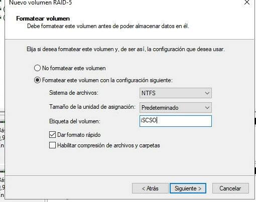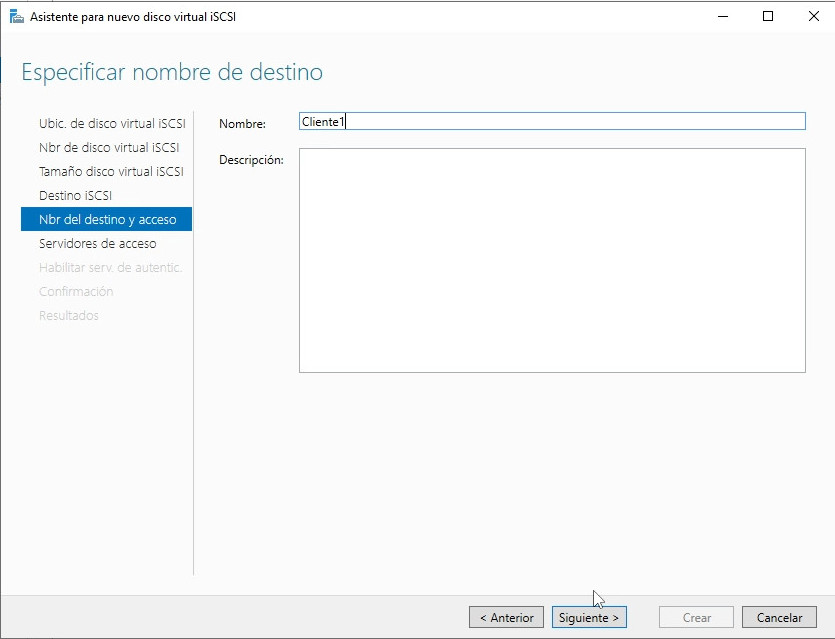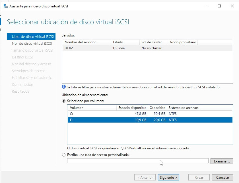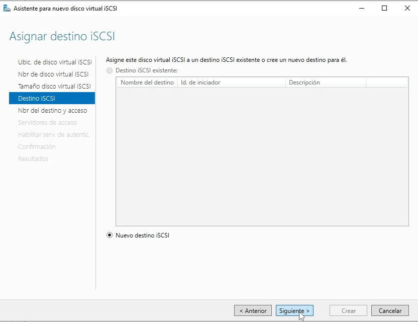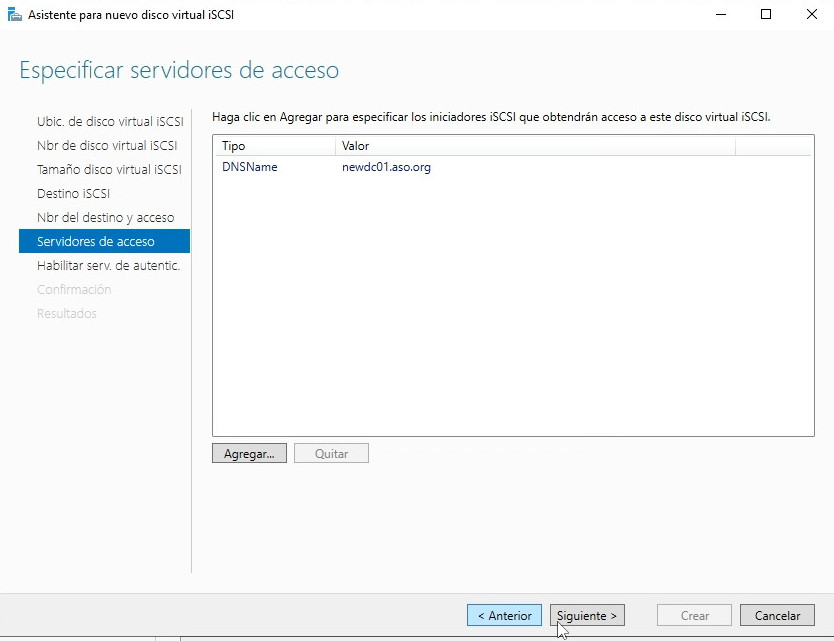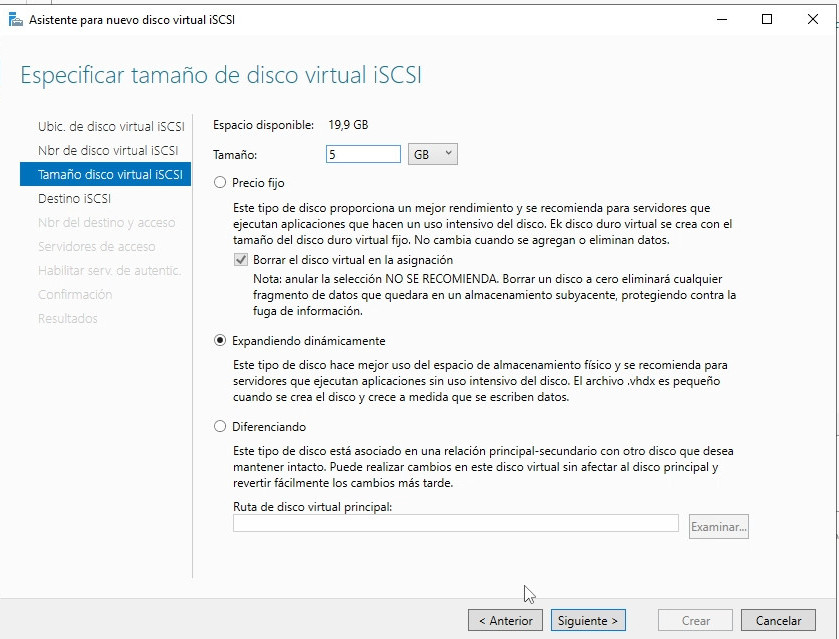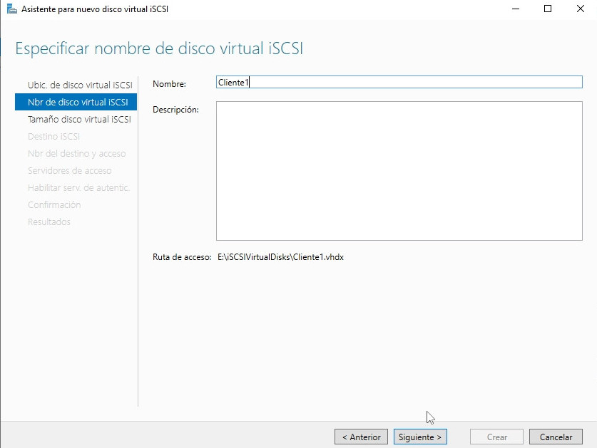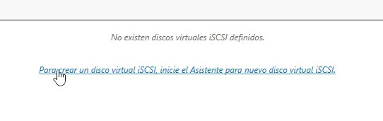 Una vez creado el volumen podemos crear un disco virtual que sera el compartido por iSCSI. Cuando creamos uno nos pregunta por el nombre, el tamaño y el destino del disco virtual (el equipo permitido para conectarse a ese disco).
