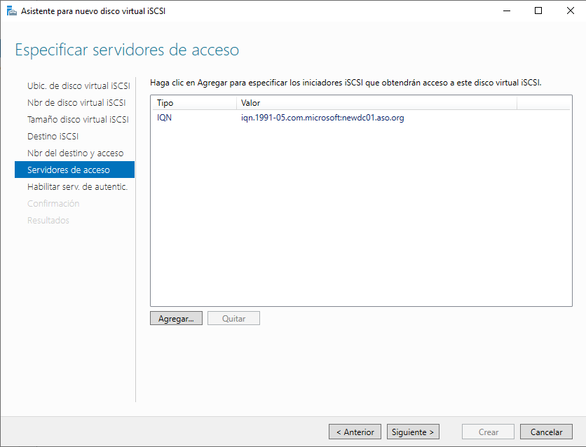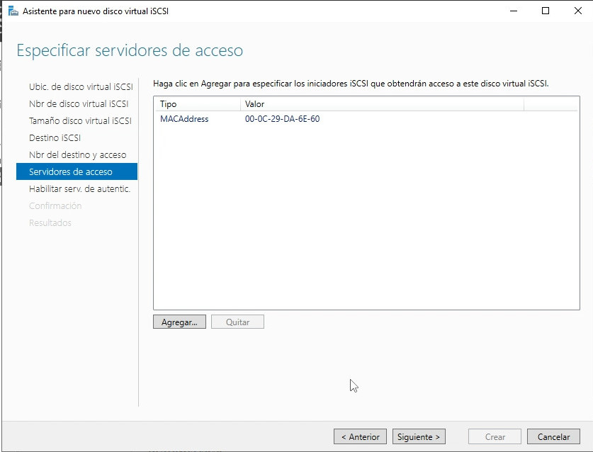 En el momento que creamos el destino nos da la opción de darle un nombre y los equipos al que le damos acceso, estos equipos los podemos seleccionar por la dirección MAC del NIC, el nombre de DNS, la dirección IP y el IQN que lo podemos escribir, seleccionar si anteriormente se ha conectado o consultarselo al equipo si tiene el servicio del iniciador iSCSI en ejecucion.