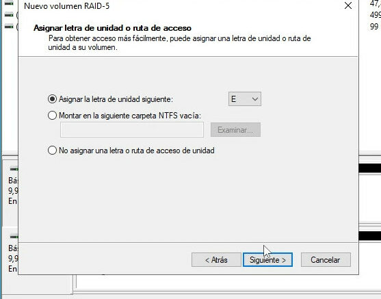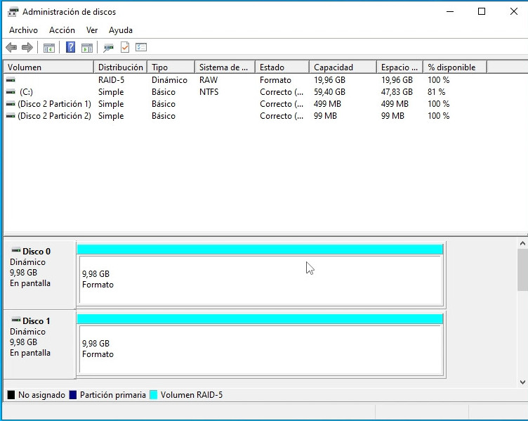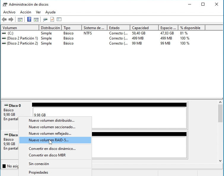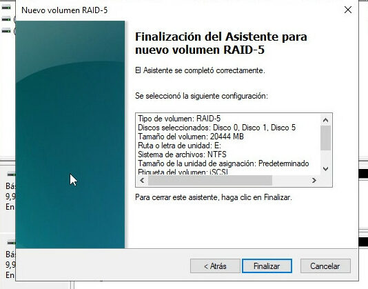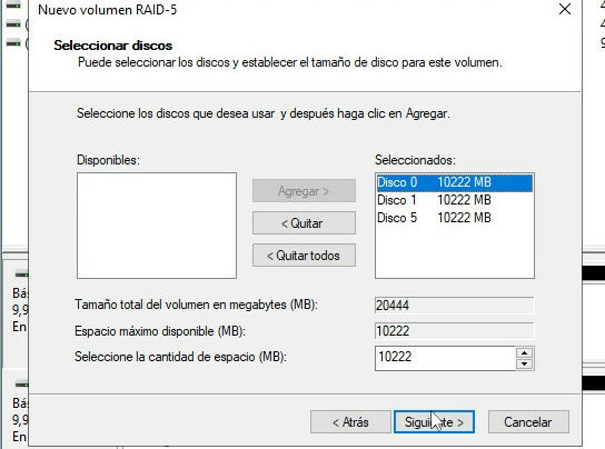 Una vez que se halla instalado podemos insertar los discos y crear un conjunto de los discos «RAID», yo creo un raid-5 para que si un disco falla no se pierdan los datos.