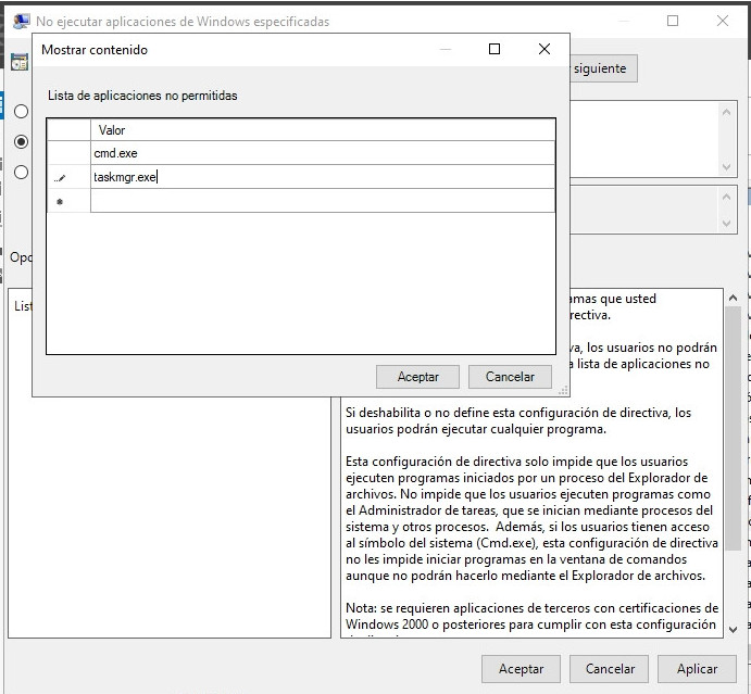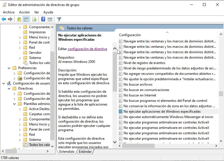 Podemos bloquear el acceso a ciertas aplicaciones gracias a las GPOs. Se llama «No ejecutar aplicaciones de Windows especificas»
