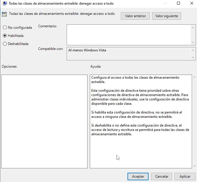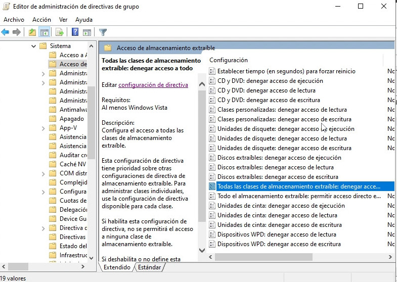 Podemos bloquear el acceso a las unidades de almacenamiento extraíbles. Se llama «Todas las clases de almacenamiento extraíble: denegar acceso a todo»s