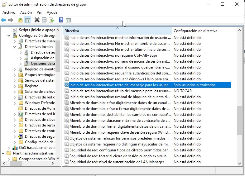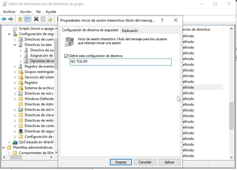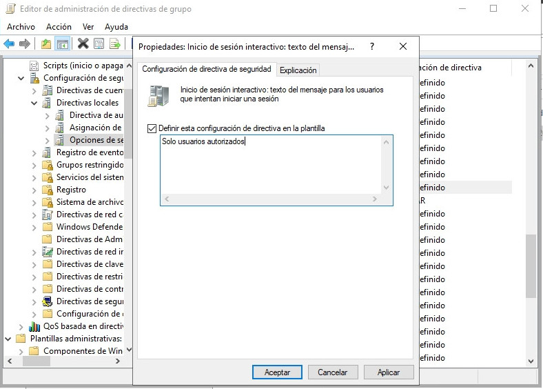 Podemos añadir un mensaje en la pantalla de inicio de sesión utilizando una GPO, para ello vamos a Configuración del equipo –> Directivas –> Configuración de Windows –> Directivas –> Configuración de Seguridad –> Directivas locales –> Opciones de seguridad y tenemos que modificar las llamadas «Inicio de sesión interactivo: texto del mensaje para los usuarios que intentan iniciar sesión» y «Inicio de sesión interactivo: título del mensaje para los usuarios que intentan iniciar sesión»