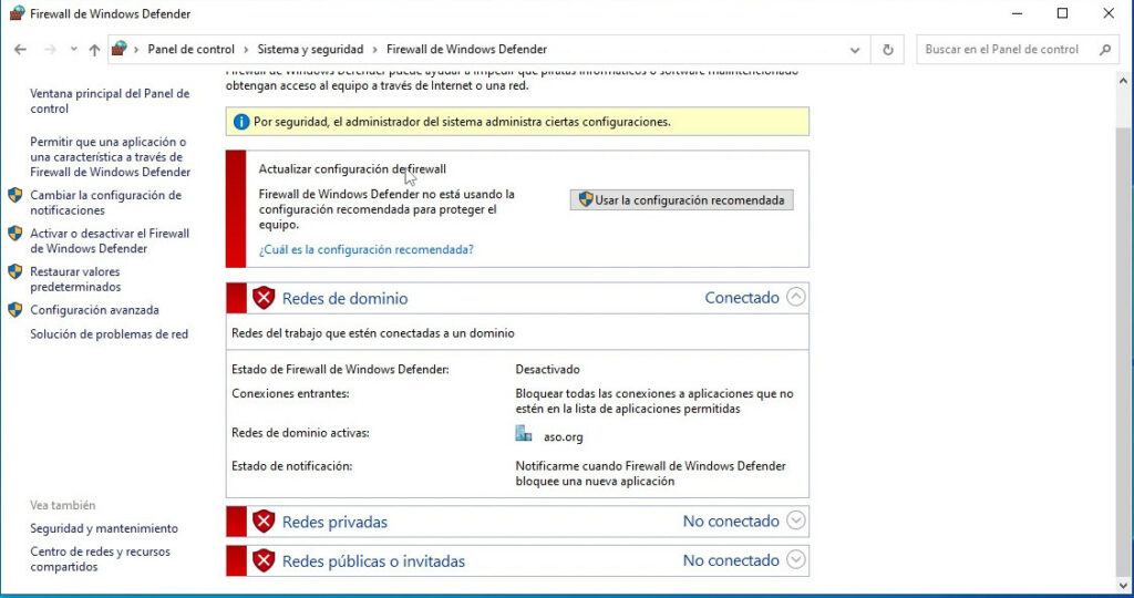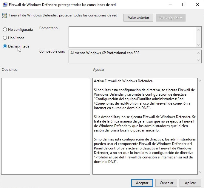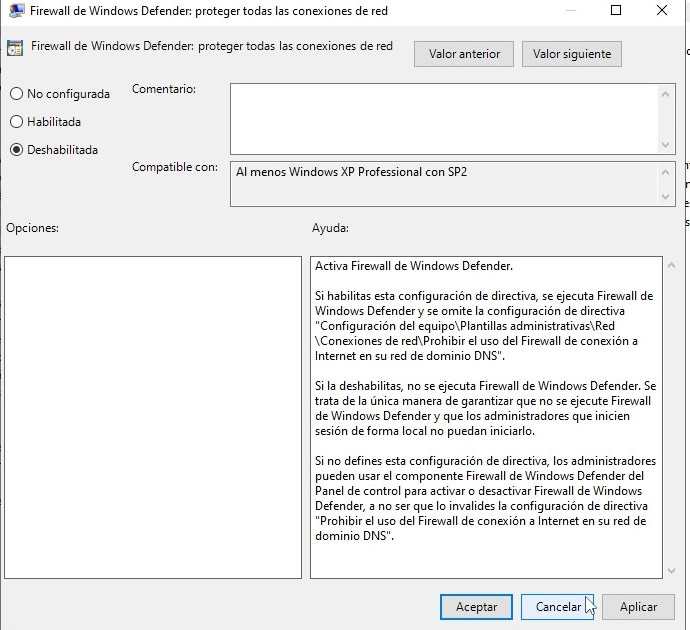 Se puede llegar a desactivar el firewall que windows integra usando la GPO llamada Firewall de Windows Defender: proteger todas las conexiones de red y se ubica dentro de Configuración del equipo –> Plantillas administrativas –> Red –> Conexiones de red.