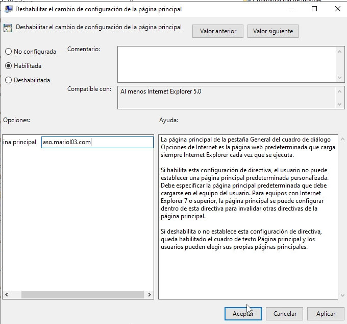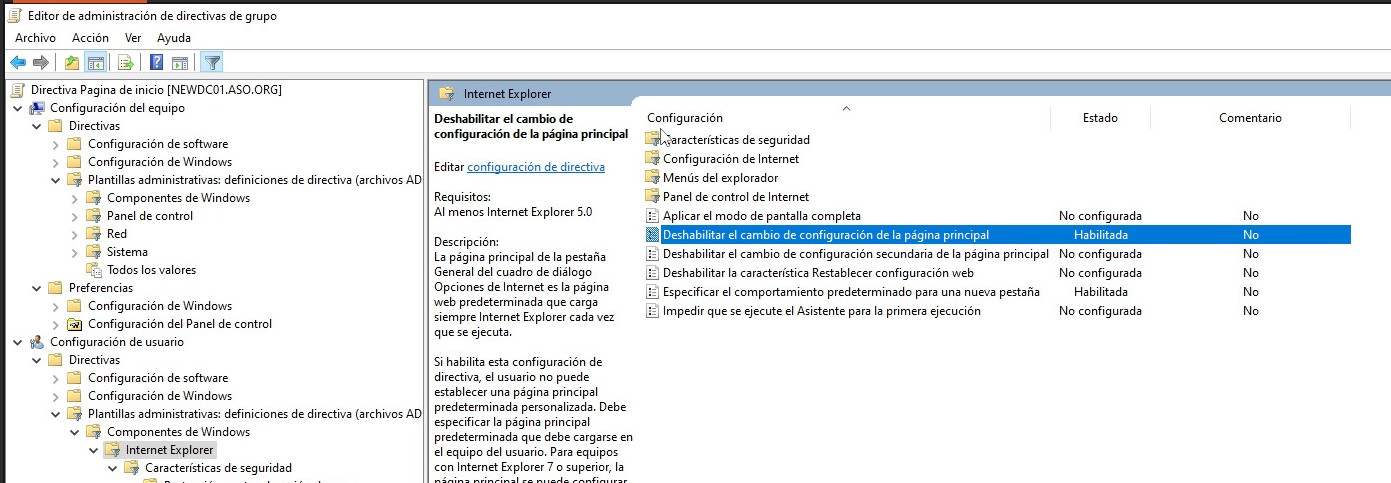 Una cosa muy útil es configurar la página de inicio de un navegador, pero tiene un problema y es que solo funciona dentro de internet explorer esta GPO se llama «Deshabilitar el cambio de configuración de la página principal». Y esta ubicada en Configuración de usuario –> Directivas –> Plantillas administrativas –> Componentes de Windows –> Internet Explorer –> Características de Seguridad.