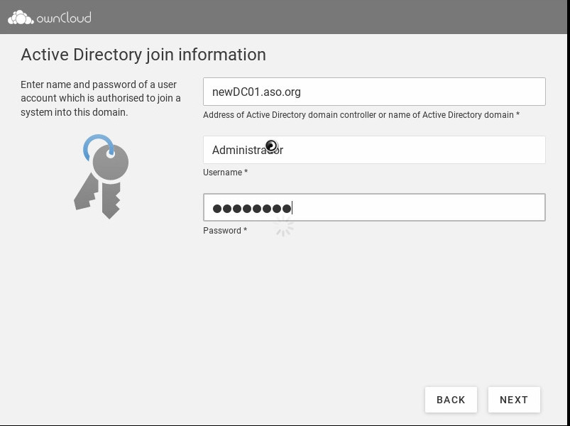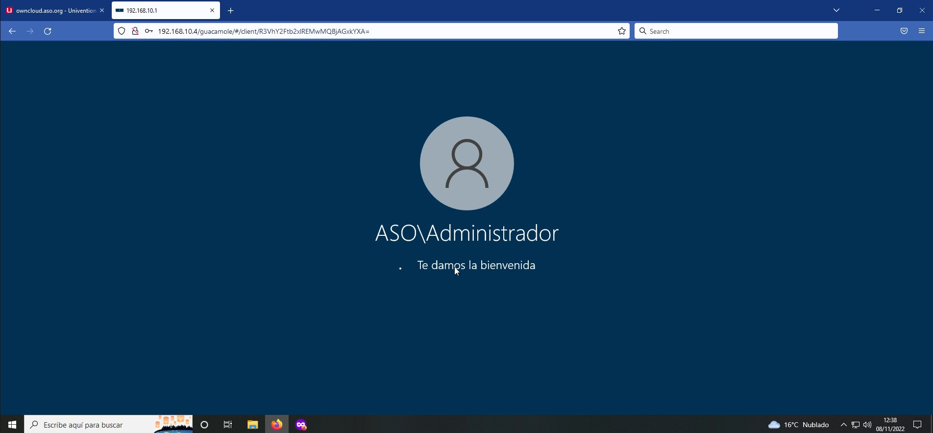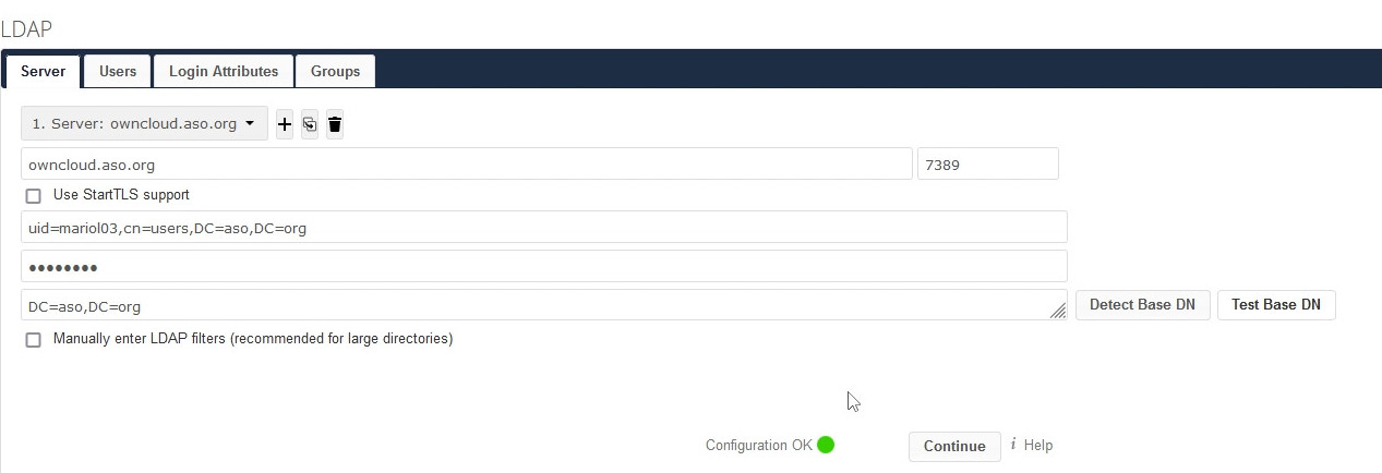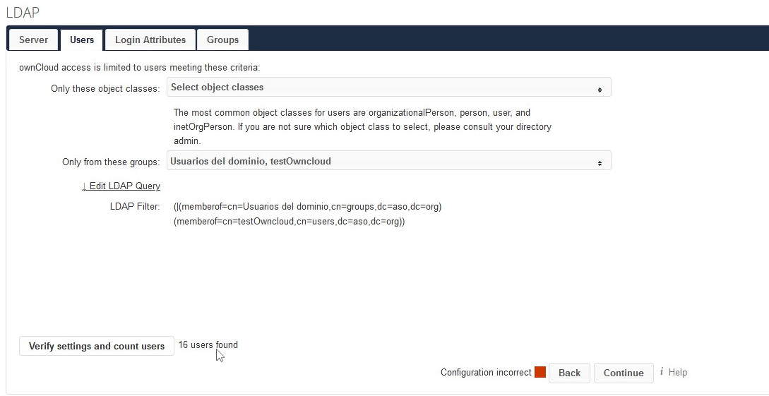 Una vez activado podemos ver si ha encontrado los usuarios de active directory correctamente y tambien entrar en la instancia de ownCloud que se ha creado, aunque por el momento solo podemos iniciar sesión localmente.