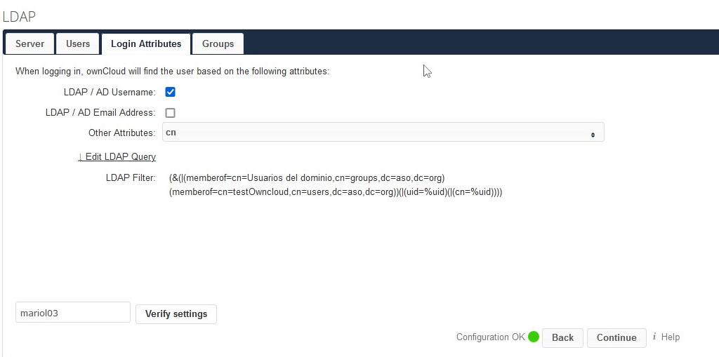 Configuración servidor y autenticaciónConfiguración de usuariosAtributos de inicio de sesiónConfiguración de grupos