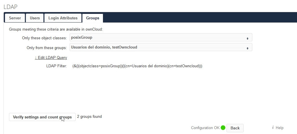 Una vez configurado el LDAP, vamos a la configuración de usuarios y vemos si aparecen los grupos, si no aparecen iniciamos sesión con un usuario del dominio, es posible que falle un par de veces ya que lo tiene que crear.