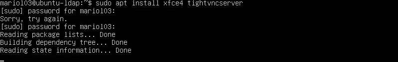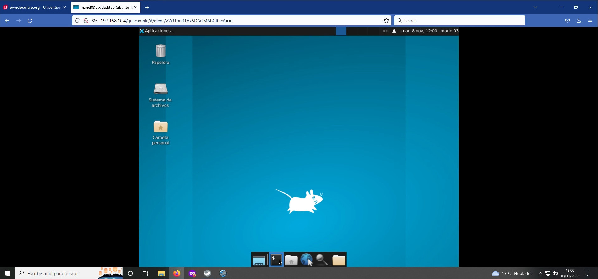 Guacamole también permite usar otros protocolos como VNC o SSH. Para comprobar que funciona VNC, he instalado una máquina ubuntu y dentro de esta un escritorio xfce4 y el servidor vnc llamado tightvncserver.