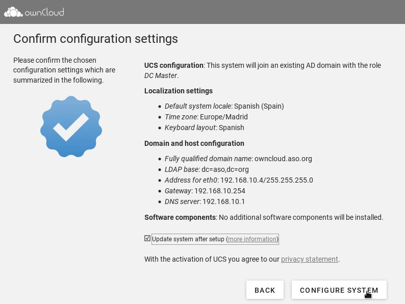 Una vez configurado la zona horaria, si queremos unir la maquina a un dominio de UCS o de microsoft, la información sobre el dominio al que nos queremos unir, información como el hostname y la contraseña del usuario root y si queremos actualizar el sistema al terminar la instalación.