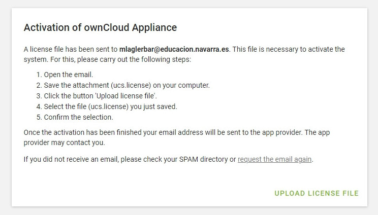 Una vez instalado nos preguntara por una licencia como no la tenemos al momento, ponemos un correo y subimos el fichero de la licencia.