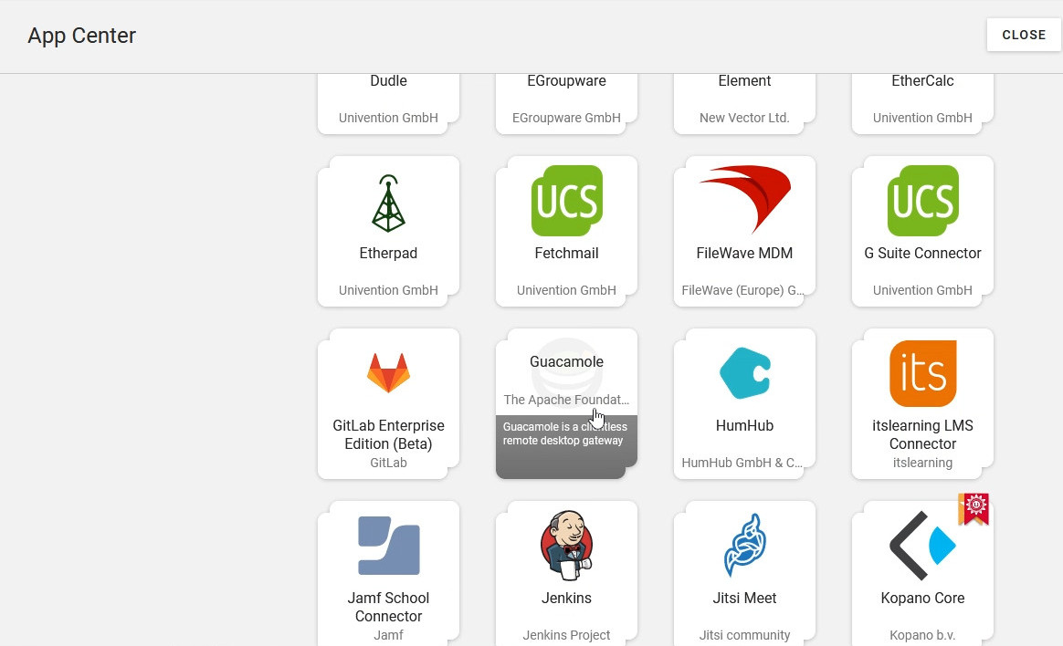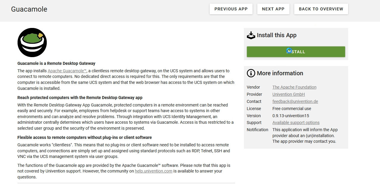Para instalar el servicio de guacamole vamos al directorio de aplicaciones y buscamos guacamole, una vez seleccionado pulsamos el botón instalar. Cuando se halla instalado este aparecerá dentro del inicio, en las aplicaciones.