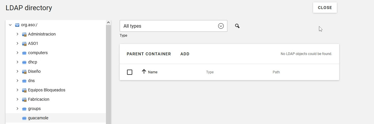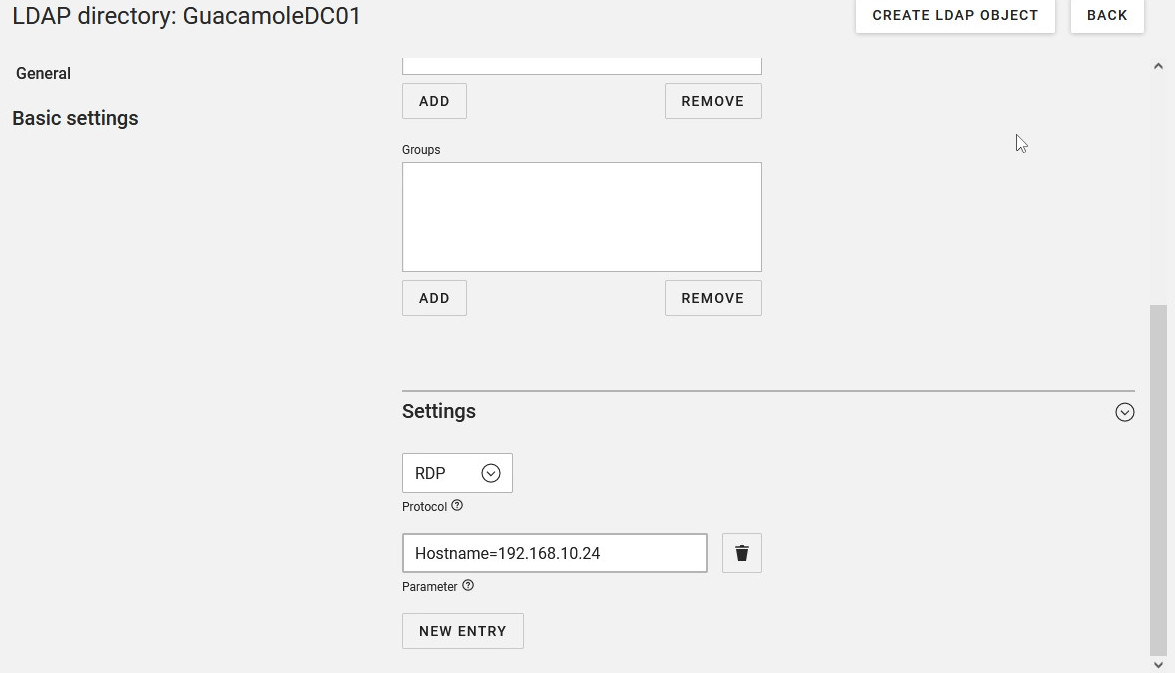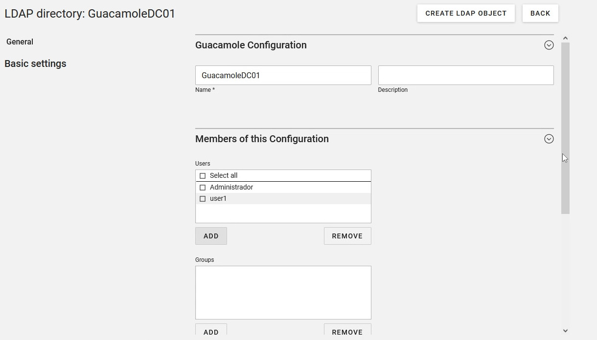 Una vez instalado abrimos el directorio de LDAP y buscamos dentro la UO de guacamole. Una vez dentro añadimos un objeto llamado «Guacamole Configuration», En el momento de crearlo, el nombre que tendrá será el nombre que tendrá la configuración, los usuarios añadidos serán los usuarios que tendrán esa conexión y la configuración del equipo sera el el equipo al que nos conectaremos. En esta configuración del equipo tenemos que especificar el protocolo y el hostname o la dirección IP del equipo al que nos vamos a conectar. También para que pueda iniciar el usuario sesión dentro del servidor guacamole hay que decir que es usuario de guacamole.
