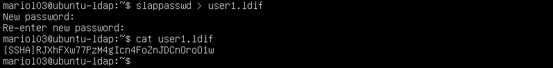 Para crear un usuario necesitaremos una contraseña cifrada y para esto se instala una herramienta llamada slappasswd que muestra la contraseña en pantalla si es ejecutada, pero como estamos dentro de una shell no podemos copiar y pegar, para esto podemos pasar la salida del comando a un fichero y luego modificar ese fichero con un editor de textos.